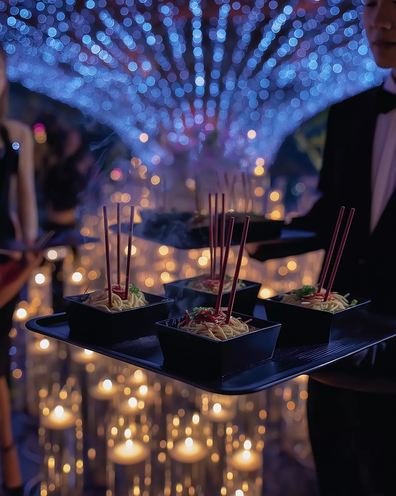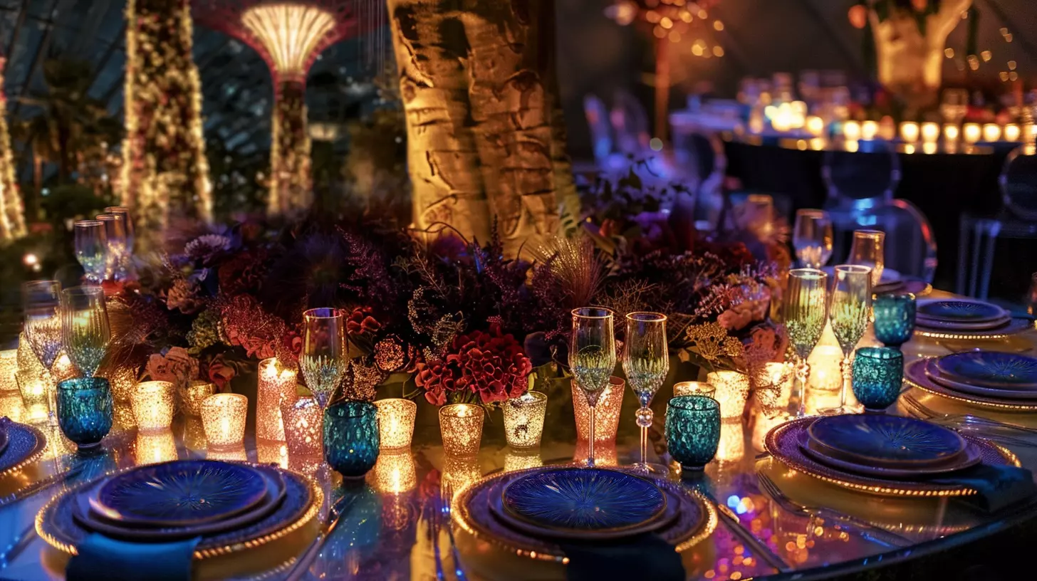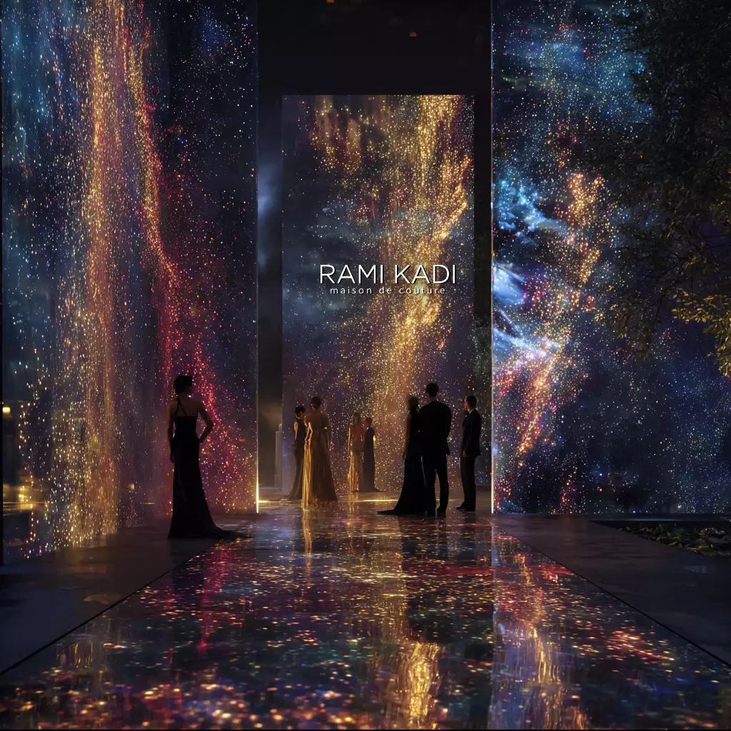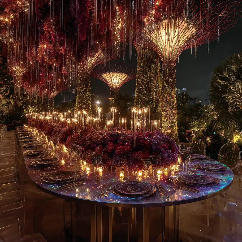 This event pulls guests into the heart of Rami Kadi’s Cosmic Waterfall. Guests arrive through a holographic entrance where cosmic florals and digital galaxies flow across their bodies as they step into Gardens by the Bay, Singapore. Celestial pathways lead them into the iconic Supertrees, where crystal strands descend from the trees and transparent tables encircle them, dressed in deep-toned florals, crystal candles and tableware, echoing the artwork’s palette. Asian culinary creations are presented, alongside hands-on DIY ice cream and drinks engaging experiences. Suspended violinists perform in the air, as crystal artistry is delicately applied to guests upon arrival, and bespoke bracelets are crafted using materials rooted in the artwork.