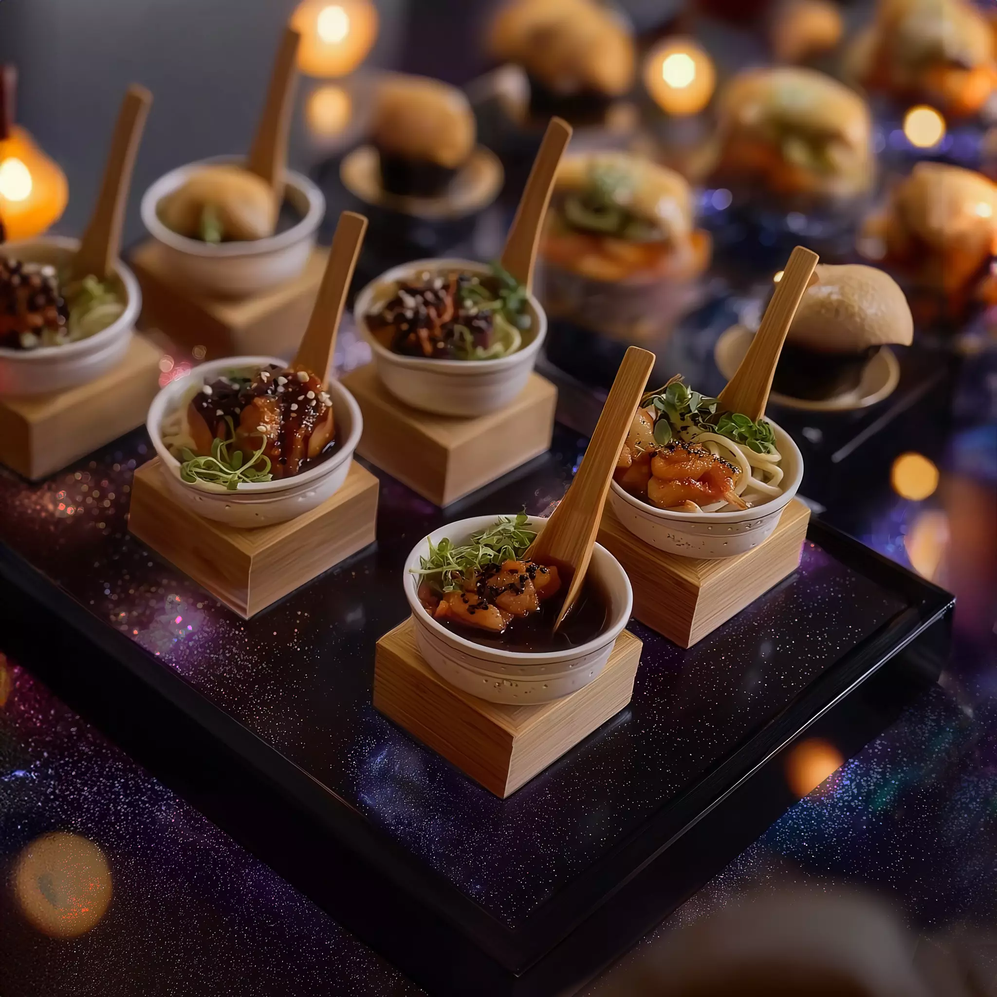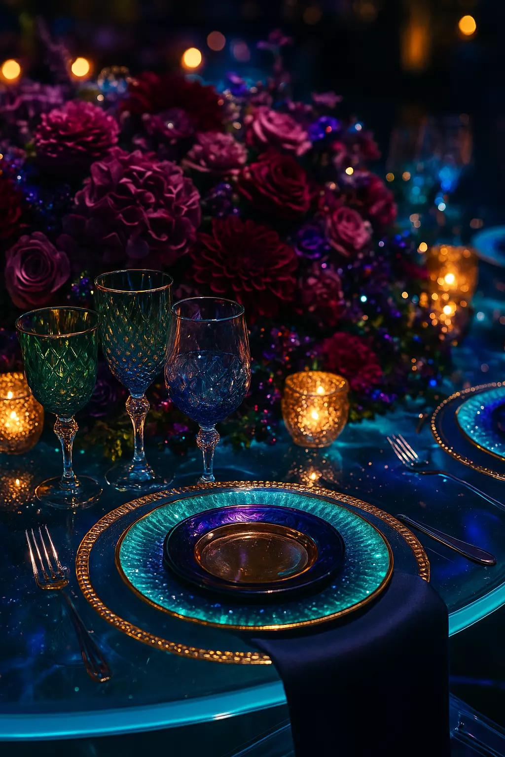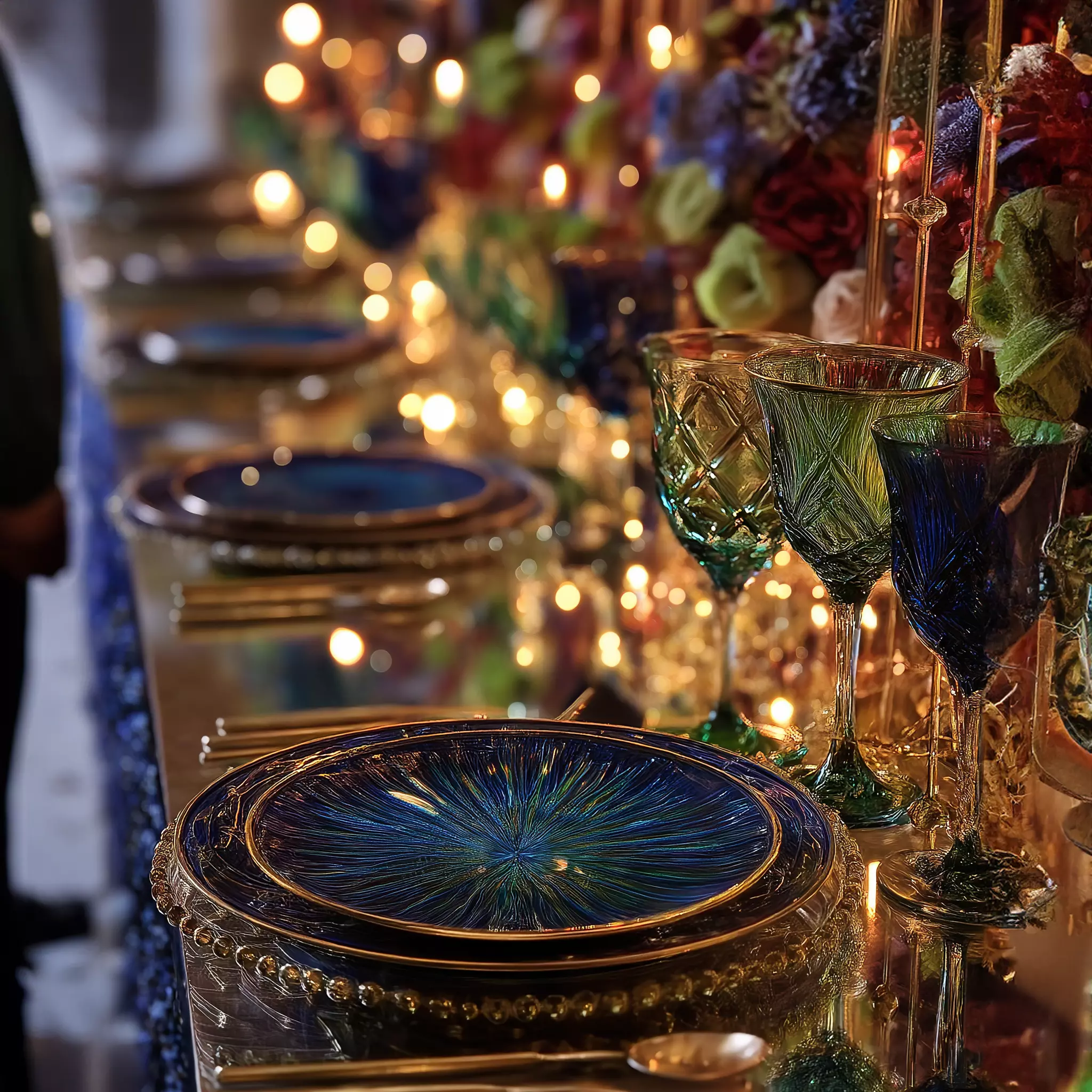 This event pulls guests into the heart of Rami Kadi’s Cosmic Waterfall. Guests arrive through a holographic entrance where cosmic florals and digital galaxies flow across their bodies as they step into Gardens by the Bay, Singapore. Celestial pathways lead them into the iconic Supertrees, where crystal strands descend from the trees and transparent tables encircle them, dressed in deep-toned florals, crystal candles and tableware, echoing the artwork’s palette. Asian culinary creations are presented, alongside hands-on DIY ice cream and drinks engaging experiences. Suspended violinists perform in the air, as crystal artistry is delicately applied to guests upon arrival, and bespoke bracelets are crafted using materials rooted in the artwork.